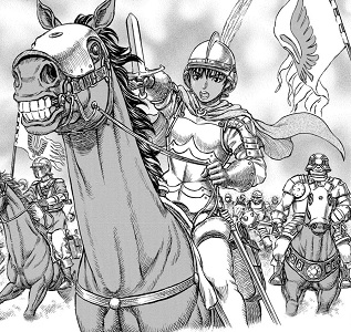 Casca is the only worthy female soldier in Berserk. When she was fighting under Griffith in the original Band of the Falcon, she was said to be a better swordsman than the men themselves. She was respected and feared by her male comrades because her skills were superior to them, and she was only surpassed by Griffith. She could easily take down male opponents larger than herself with her physical strength and expert swordsmanship. Her appearance also fit for battle with short bob hair and plain unadorned armour. In the battle of men, Casca was a rare sight, yet her power rivalled and even outshone any opponents. Even Guts, when first battling Casca, had no idea that it was a woman until the armour mask fell down. Though Casca’s strong image has lost after the Eclipse, I still adore her and always remember her as the third most powerful warrior (only after Griffith and Guts) in the Band of the Falcon during the Golden Age arc. That is also the best and most memorable arc in Berserk, where all things begin. By the way, Berserk is also my favourite manga series of all time, and possibly the darkest one ever written.