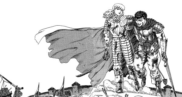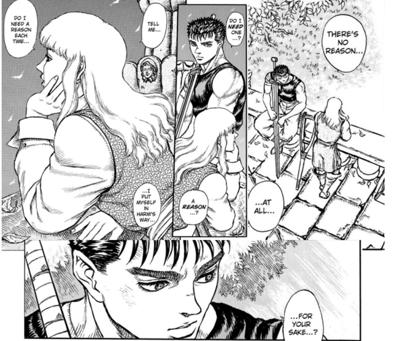 Let us now come to the last pick in my list and I understand that this one might be controversial. There has been much discussion around Berserk fandom whether or not there are romantic feelings between Guts and Griffith. People mostly agree that their relationship is larger than friendship, but some say it’s just a ‘bromance’. As for me, I don’t want to complicate. From a woman’s point of view, what happens between Guts and Griffith is definitely love, whether romantic or not, that is love. It is love at first sight even from Griffith’s part; it is this love that he values more than his royal dream and his own life, and it is also this love that leads him derail, corrupts him and drives him into a demon.