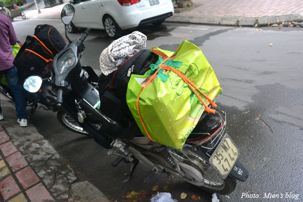 We left Hanoi at around 7.30 in the morning. All 4 bikes were manual ones. Basically each bike looked like this, with a big bag of gifts at the back or in front and 2 people on it, each with their luggage!